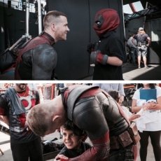 El niño aparece en una de ellas usando la máscara de Deadpool y mirando al actor.