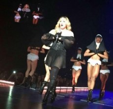 En este nuevo y controversial tour, Madonna incluyó a algunas bailarinas vestidas como unas monjas muy sensuales que danzan sin vergüenza por todo el escenario, y se menean sin parar alrededor de unos tubos de striptease que simulan unas cruces.