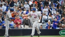 Sus compañeros de equipo salieron de la cueva de los Mets para festejar el batazo, mientras Colón daba la vuelta al cuadro.