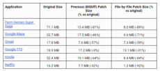 El pasado verano consiguieron reducir el tamaño de las actualizaciones en un promedio de un 47% gracias al algoritmo bsdiff (por Colin Percival) que ahora ha sido mejorado con el nuevo parcheado de fichero por fichero, logrando así reducir el tamaño de las actualizaciones en un promedio del 65%, y en algunos casos en más del 90%.