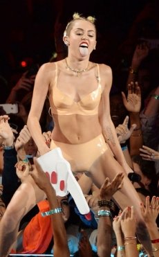 Como sabrán, el pasado domingo Cyrus se quitó la ropa y uso un conjunto de ropa interior en color piel para cantar junto a Robin Thicke el tema Blurred Lines en el que la ex Hannah Montana aprovecho para demostrar sus habilidades para el twerking, bailando sensualmente y frotando una mano de goma espuma contra su entrepierna.
