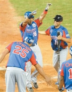 Las carreras Al igual que en el primer partido, el equipo dominicano comenzó de inmediato anotando carrera en la misma primera entrada, mediante sencillos seguidos de Leury García y Héctor Gómez, luego de un out ambos avanzaron a tercera y segunda por pitcheo salvaje del abridor Yasmany Hernández, quien otorgó boleto intencional a Ronny Paulino para llenar las bases y luego dio otro boleto a Emilio Bonifacio para que entrara la primera carrera.