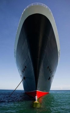 Parece un punto junto a una inmensa i. En realidad, es el capitán Kevin Oprey, que aceptó posar hace unos días para una de las fotos turísticas más espectaculares que recordamos: delante de su barco, el Queen Mary 2.