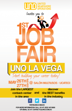 En el marco del décimo aniversario de la empresa y debido al importante crecimiento que se ha dado en la empresa, United Nearshore Operations (UNO) ha traído nuevas oportunidades de empleo para todo el Cibao y este lunes 26 y martes 27 de mayo, continuará su jornada de búsqueda de talentos en La Vega con la feria de empleos que estarán organizando para los habitantes de esta provincia.